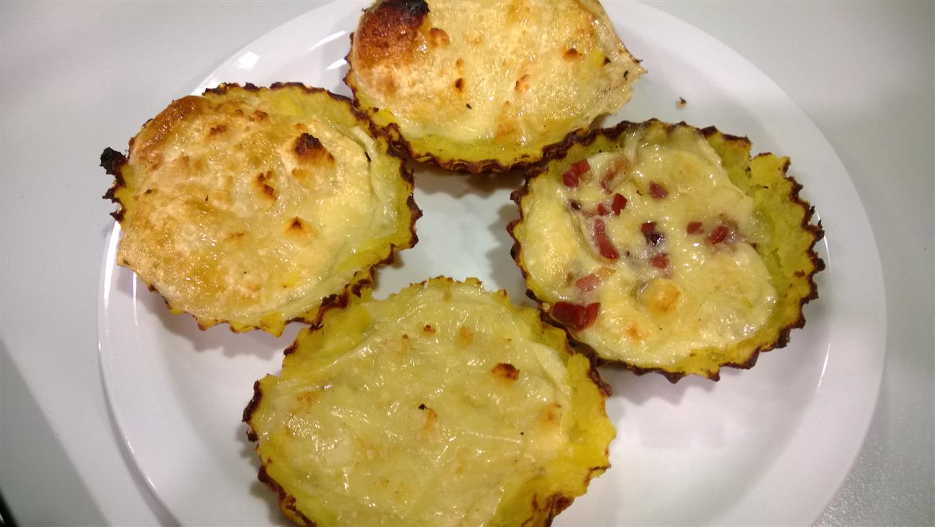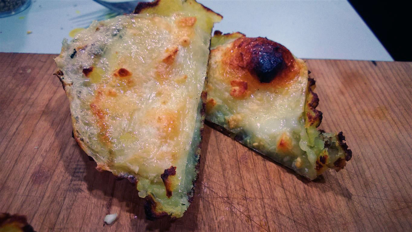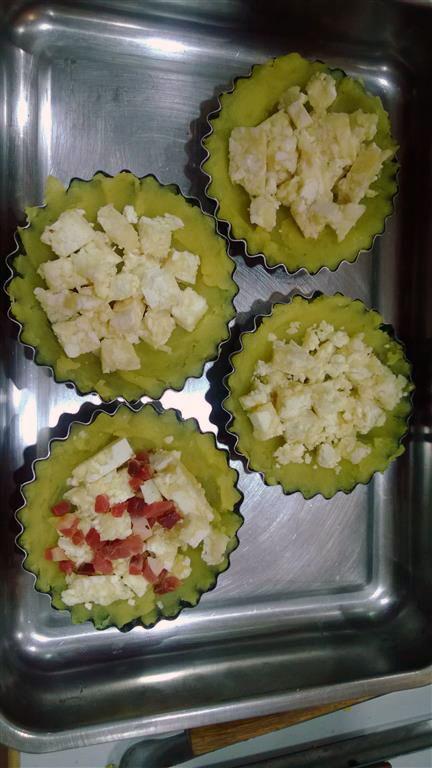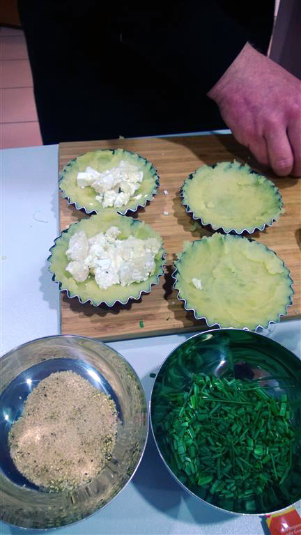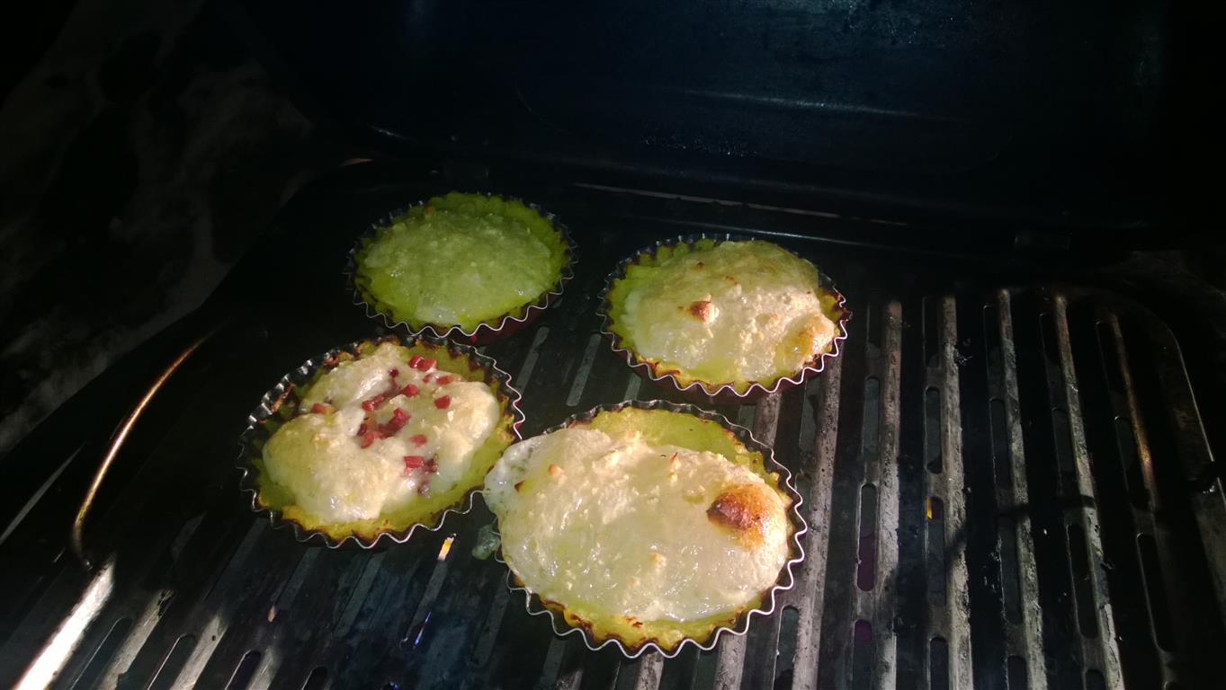 Bereitet beschichtete Förmchen vor und legt diese mit dem Kartoffelteig aus. Die Schicht sollte den Boden gut bedecken, aber nicht zu dick sein. Füllt die Form mit Graukäse auf und dann ab in den Smoker, Ofen oder auf den Grill (mit Deckel). Den Grill auf ca. 150°C vorheizen und die Form auf direkter Hitze platzieren. Sobald die Oberfläche eine schöne goldgelbe Farbe hat, ist die Tarte fertig.